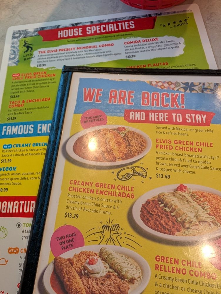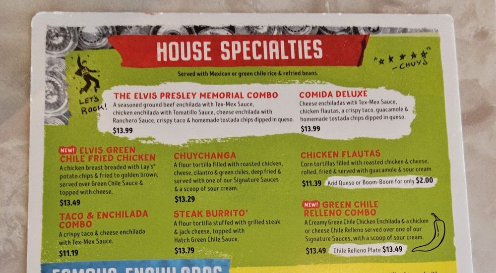 - House Specialties: The Elvis Presley Memorial Combo steals the spotlight, featuring a variety of enchiladas paired with a crispy taco and queso.